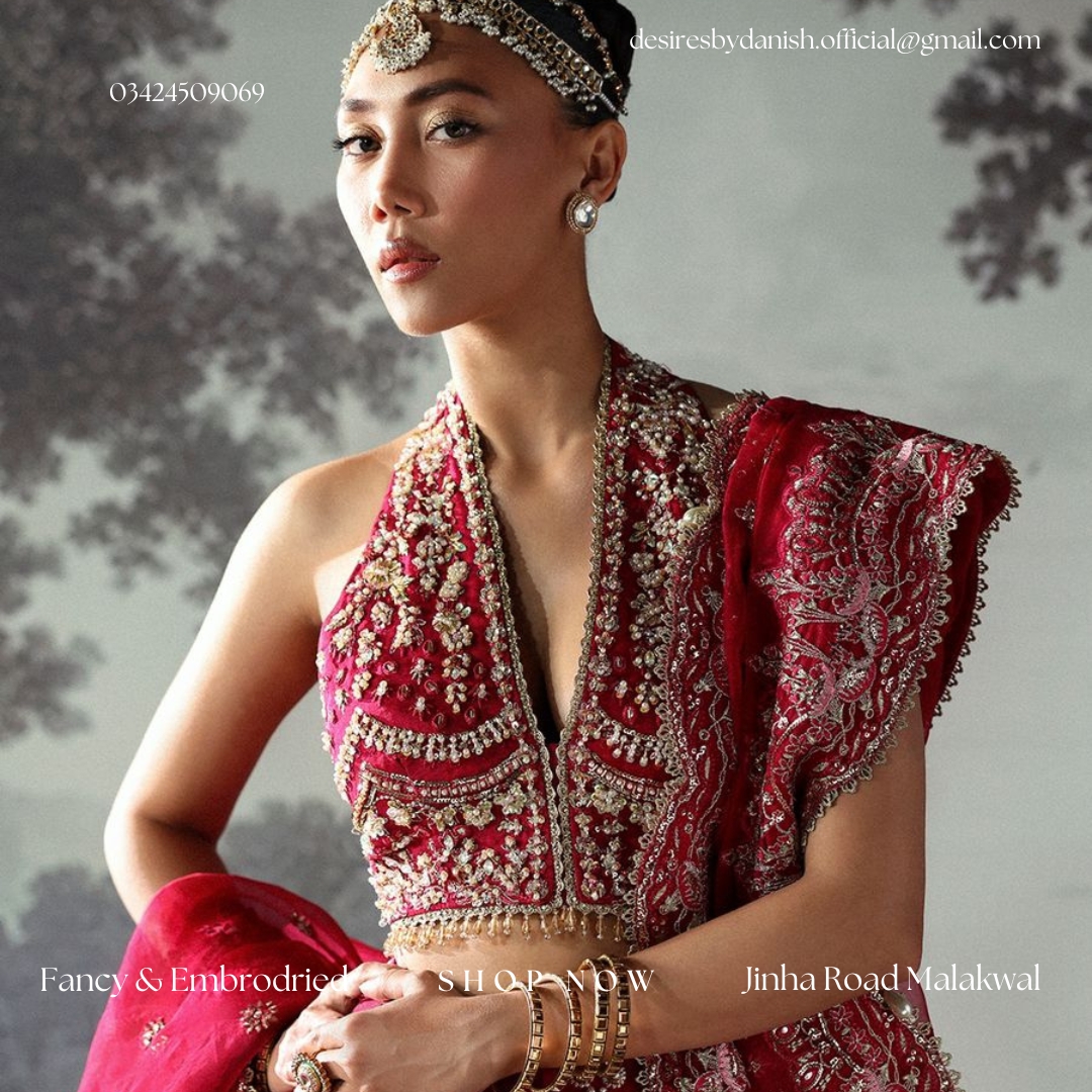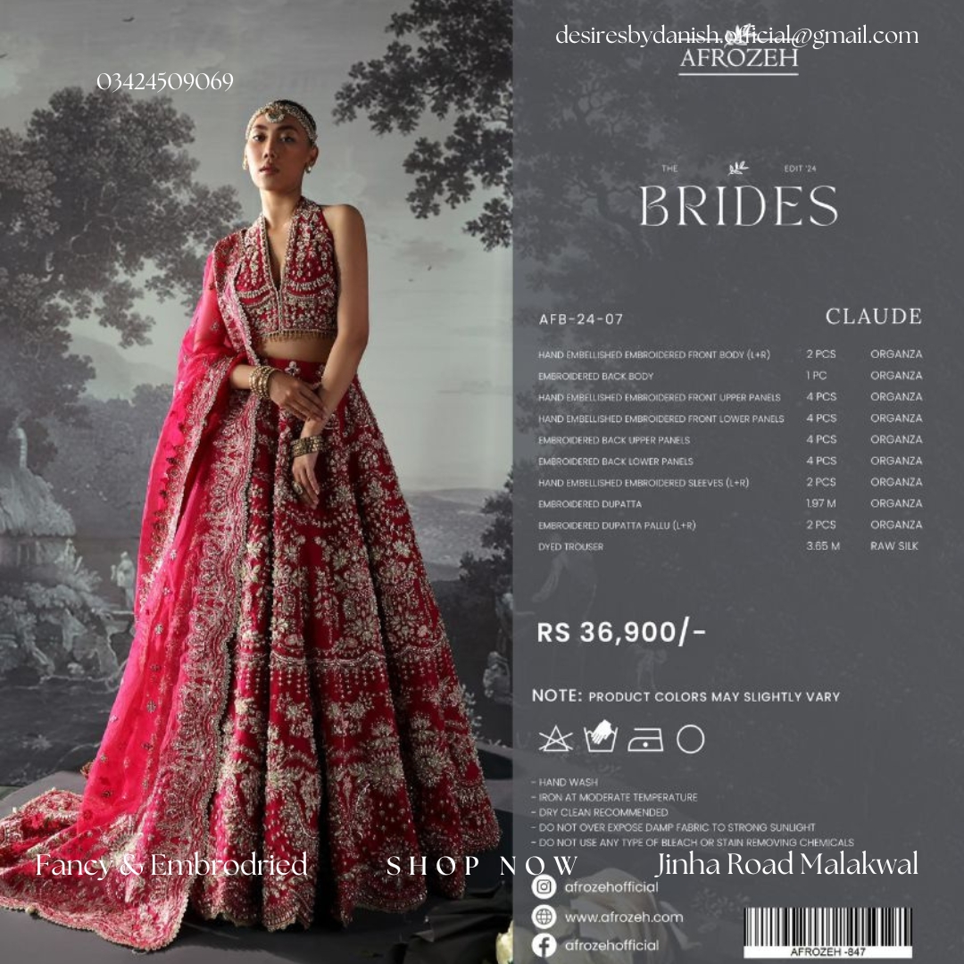 Experience timeless bridal beauty with Claude (AFB-24-07), an exquisite piece from Afrozeh’s Brides Edit 24 collection. This stunning lehenga choli set is crafted in a rich crimson tone, made from luxurious organza and paired with a raw silk dyed trouser. The outfit features intricate hand embellishments and delicate embroidery across the front and back body panels, sleeves, and dupatta. The dupatta, enhanced with embellished pallus, adds a graceful and regal touch to the overall silhouette. Perfect for brides who seek elegance and traditional grandeur, this ensemble promises to leave a lasting impression. Whether it’s for a baraat or engagement, Claude is designed to make you shine on your most special day.